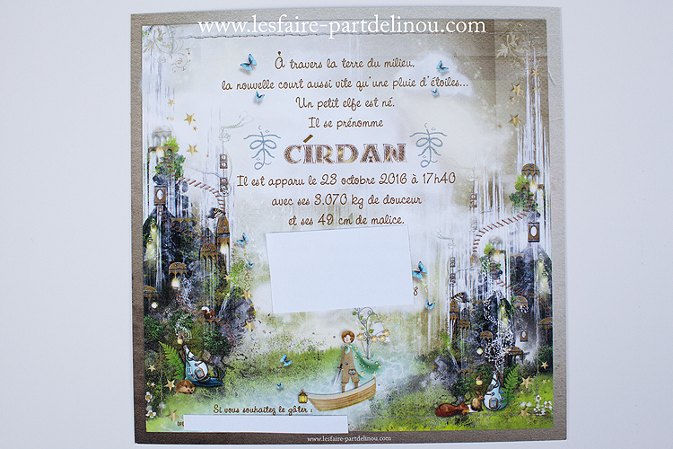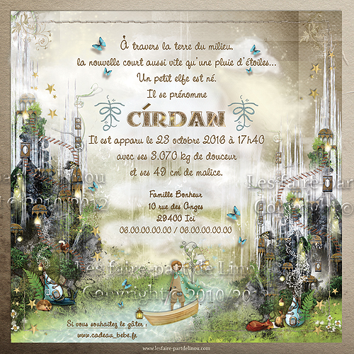 Faire-part de naissance réalisé sur le thème « de la cité elfique » aux Couleurs Bleu/ vert /marron / écru / Beige au format 15×15 cm recto/verso avec un petit elfe évoluant sur l’eau dans la cité elfique entouré d’animaux et de magie.