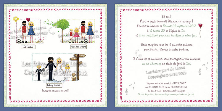 Voici un faire-part de mariage et de baptême réalisé sur le thème du foot où les futurs mariés et les futurs baptisés ont été dessinés fidèlement jusqu’au toutou de la famille !