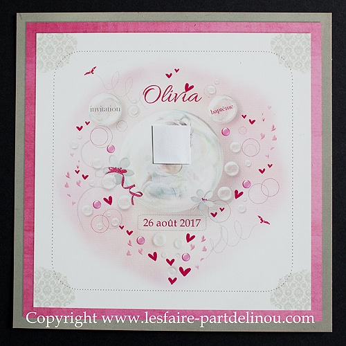 Faire-part de baptême réalisé sur le thème d’un nuage de bulles dans un univers aérien et féerique pour une adorable petite Olivia au format 15×15, recto /verso et aux couleurs fushia /gris /blanc.